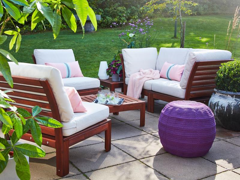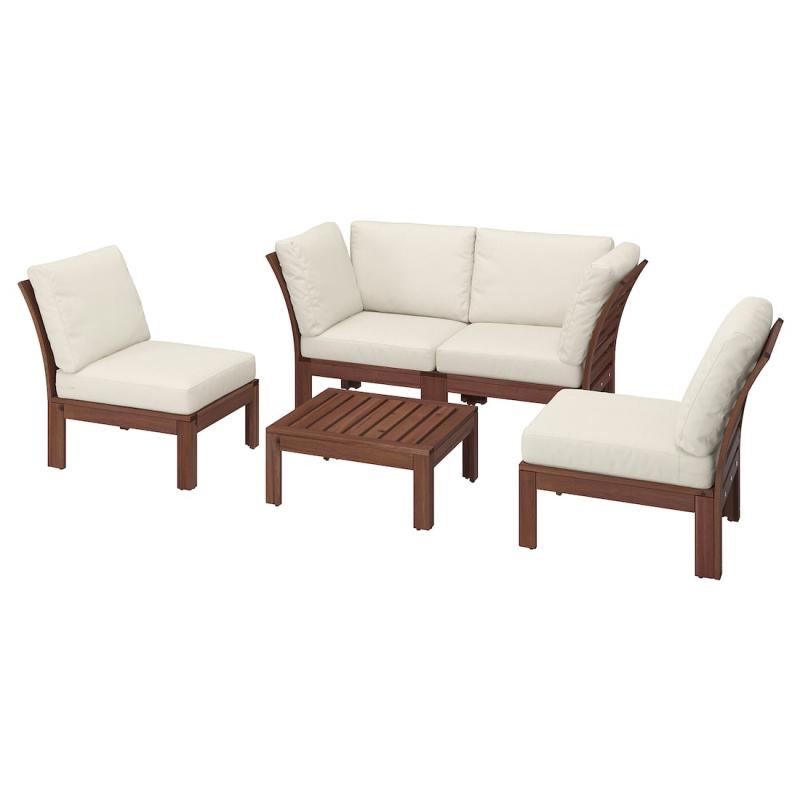 Salon d'extérieur 4 places en acacia massif avec des coussins beiges. L'acacia est un bois dur naturellement solide et résistant destiné à un usage en extérieur grâce à la densité élevée de ses fibres. Les coussins offrent une assise confortable. Cet ensemble vous aidera à créer un espace Lounge convivial et élégant.
